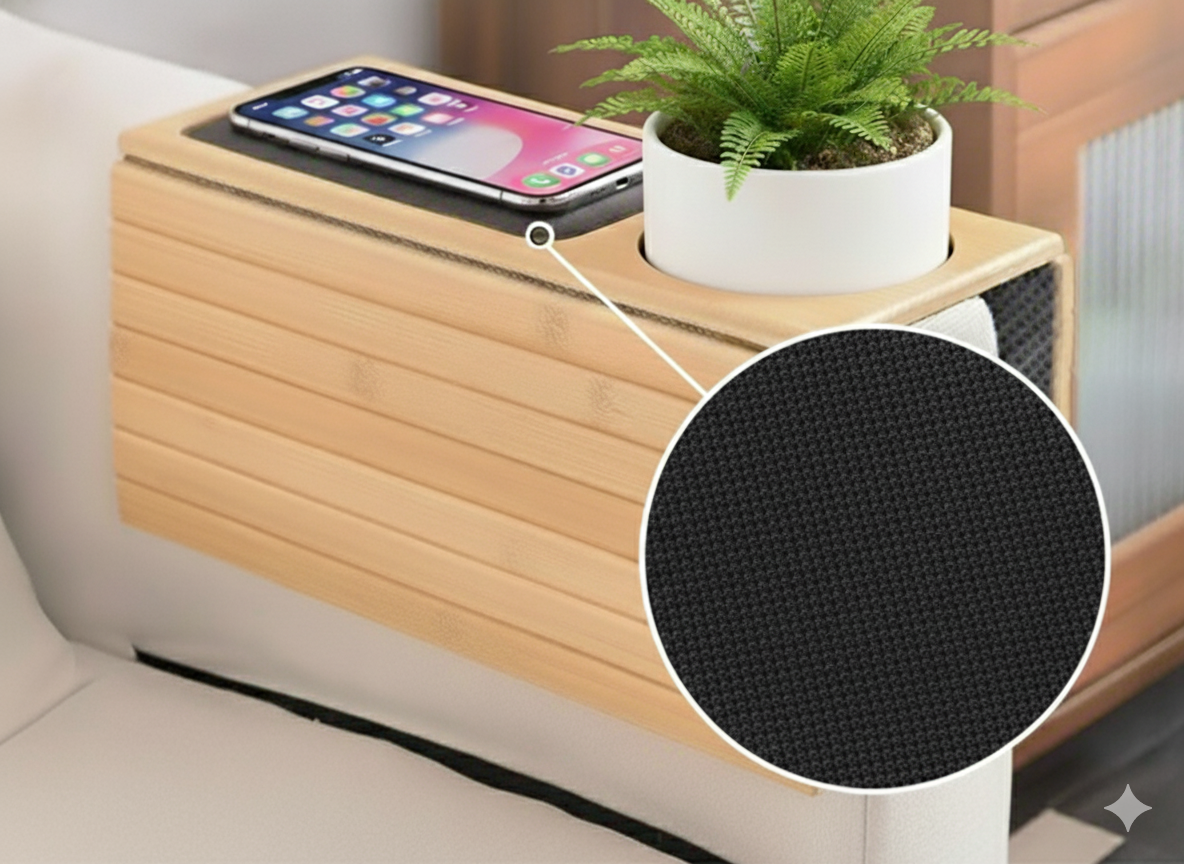. Points en caoutchouc antidérapants : assurent la stabilité du plateau sur l’accoudoir et protègent le canapé.